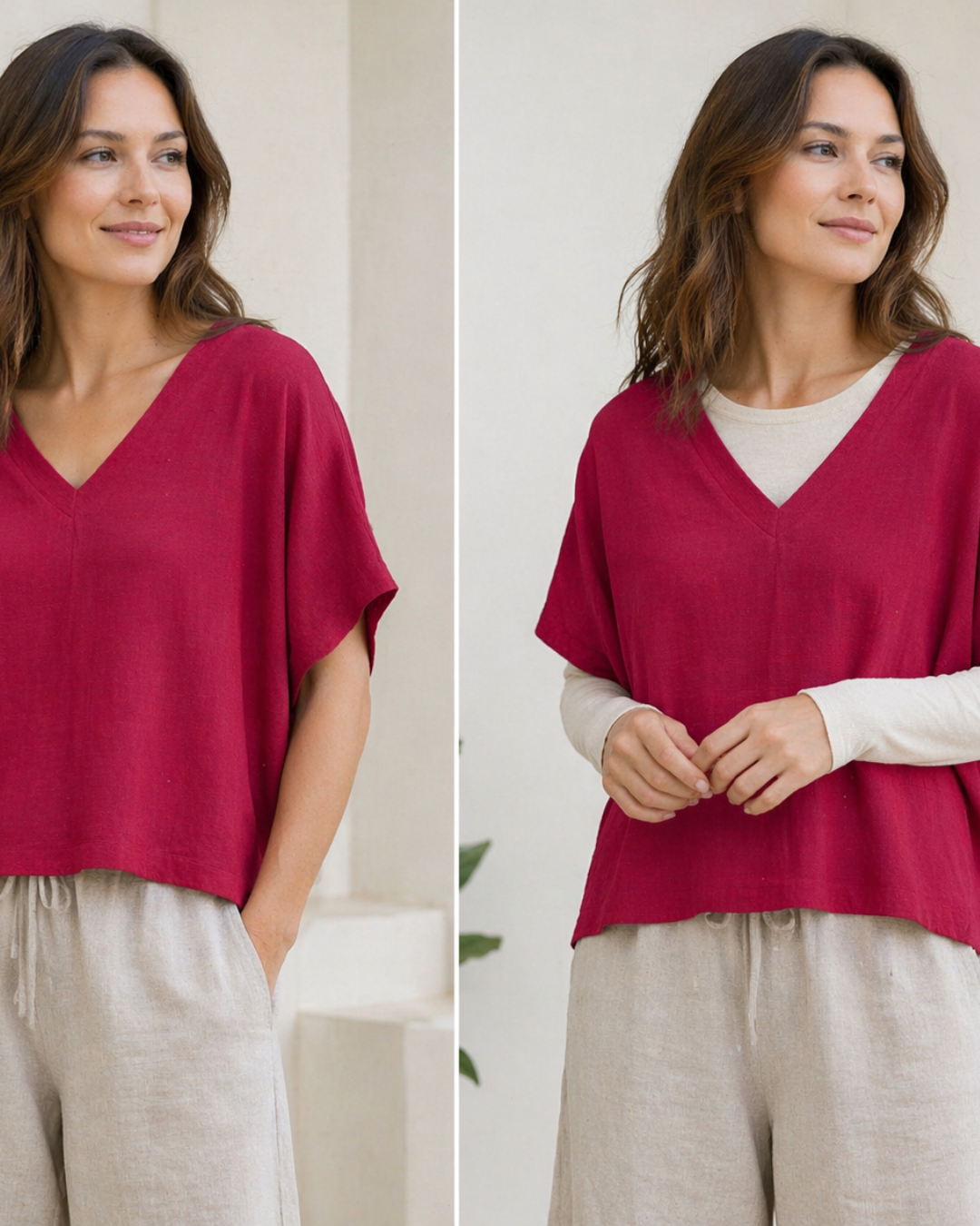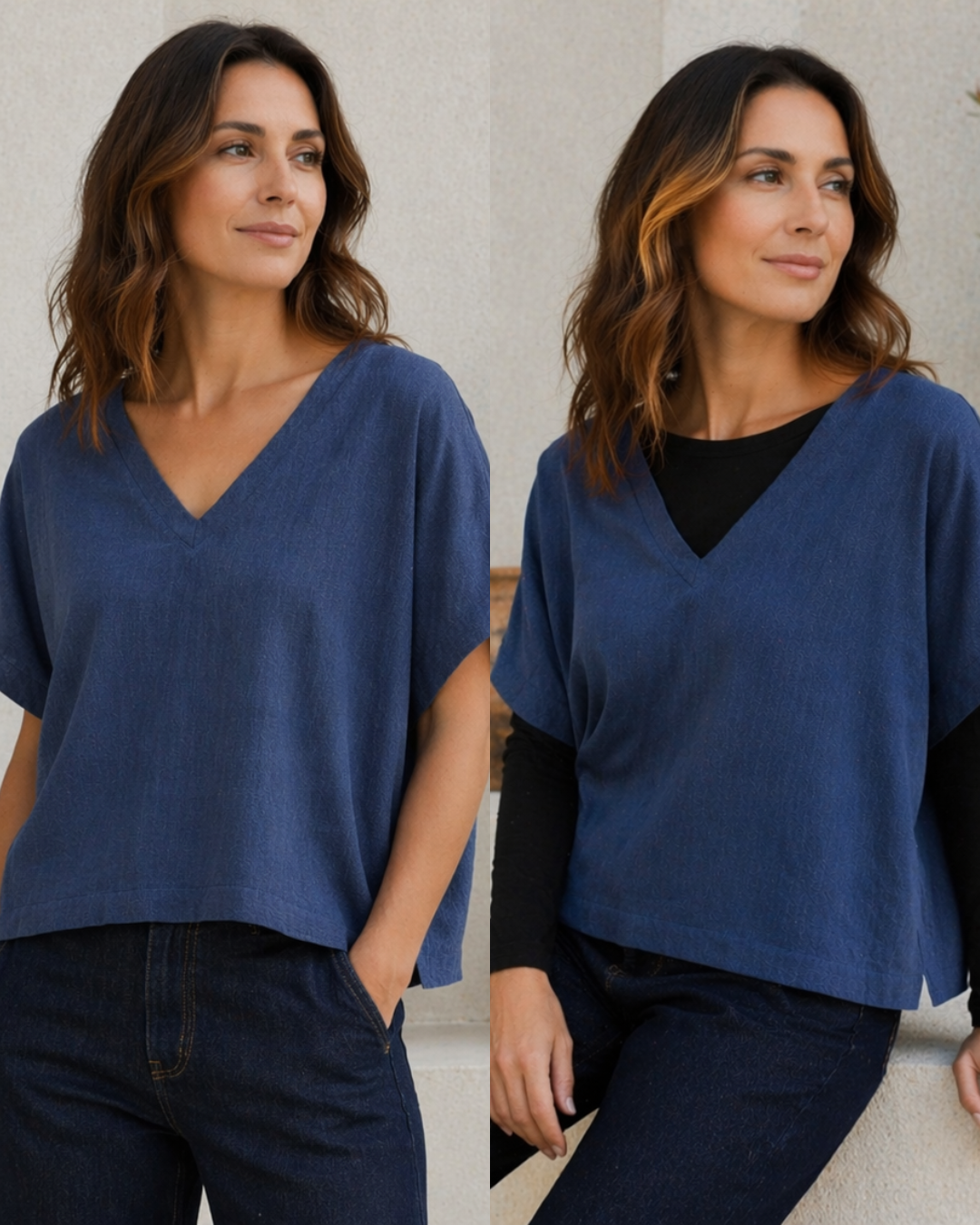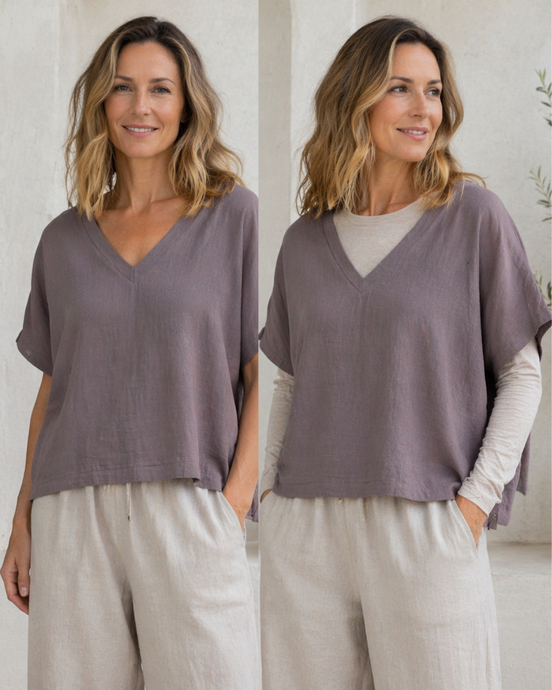 Made from a soft linen–cotton slub, it has a relaxed batwing shape that drapes effortlessly on the body, finishing just below the tummy for an easy, flattering fit. Worn on its own, it’s light and breathable for warmer days. As the weather cools, it layers beautifully over a fitted long sleeve, making it a truly year-round piece.